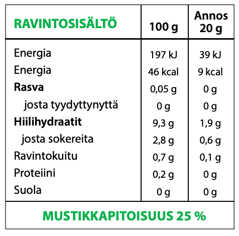 (mustikkapitoisuus 25 %), mustaherukkatäysmehutiiviste, happamuudensäätöaine (sitruunahappo), guaranauute (luontainen kofeiini), vihreä tee -uute (luontainen kofeiini), luontainen aromi, nokkosuute, makeutusaine (steviasta saatavat stevioliglykosidit).